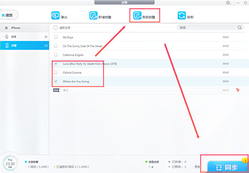 第3步:在這裡就能查看到所有三方工具製作的鈴聲,以及刪除選項。選取想要刪除的iPhone鈴聲,點「刪除鈴聲」,最後「同步」。