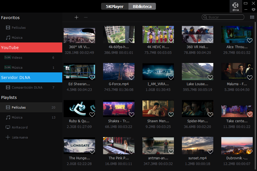 Más que reproducir películas UHD/vídeo en línea, música/radio, descargar contenidos en línea y archivos multimedia AirPlay streaming/mirroring, el software de reproducción de vídeo gratuito proporciona un tesoro en el que puede establecer su biblioteca multimedia personal con estilo. A partir de ahora, podrás acceder y gestionar los vídeos y listas de reproducción de YouTube, ordenar tus audios/videos favoritos y crear nuevas listas de reproducción clasificadas en la biblioteca de 5KPlayer a tu gusto.